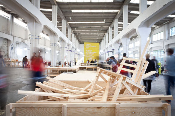Tablescape is an abstracted piece of furniture. Built according to the OpenStructures grid, it combines various functions, such as sitting-platforms, storage boxes, exhibition space and clustered tables of different heights and forms a hybrid between oversized furniture and micro-architecture. It functions as meetingpoint and is part of the overall scenography for the New Times New Heroes exhibition showcased during the Milan Design Week 2011.
